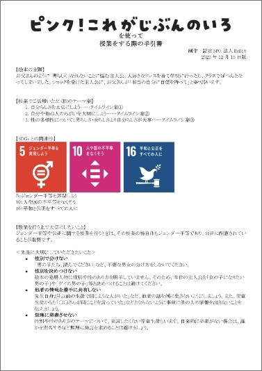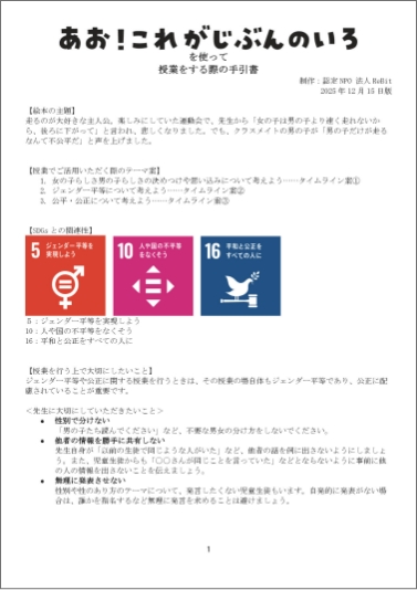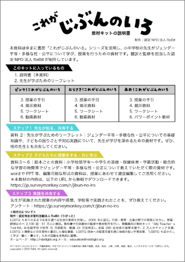 本資料はゆまに書房「これがじぶんのいろ」シリーズを活用し、小中学校の先生がジェンダー平等と公平について学び、授業を行うための資材です。翻訳と監修を担当した認定NPO法人ReBitが制作しています。