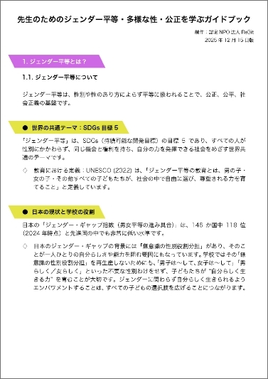 先生が学ぶためのリーフレット:ジェンダー平等と公平についての基礎知識や子どもの困りごとや対応例について先生が学びを深めるための資材です。ぜひ、他の先生と共有してください。