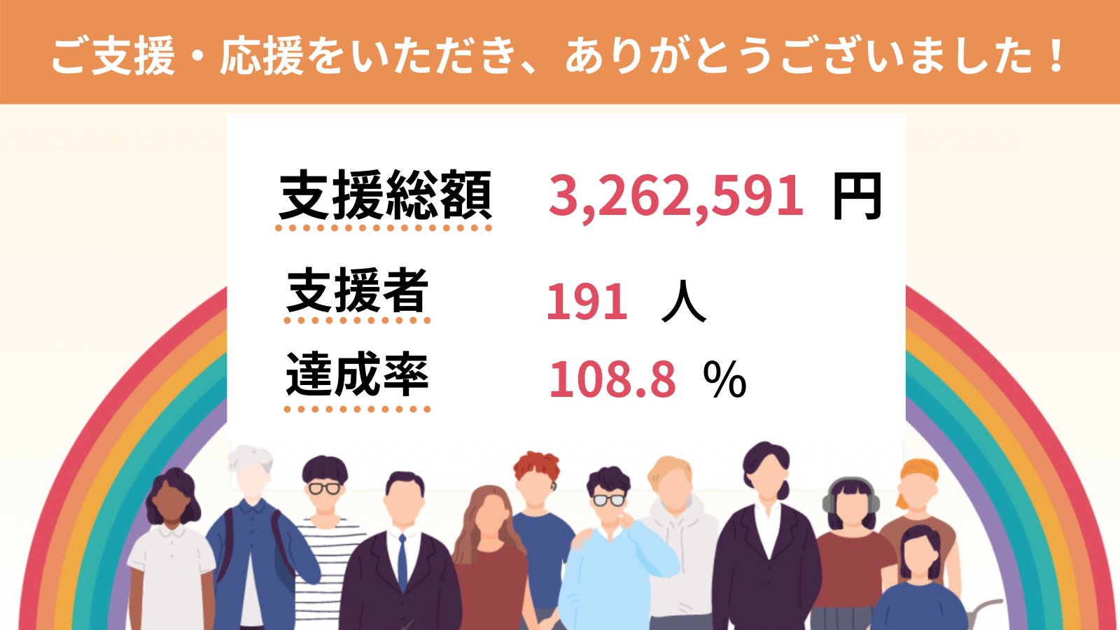 嬉しいことに62日間で191名の方がご賛同くださり、目標の300万円を超えた3,262,591円を集めることができました。